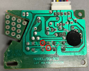 少しわかりづらいですが、右図の赤丸の部分はSW1(再生ボタン)の端子です。この2か所を導通させると音声が流れます。