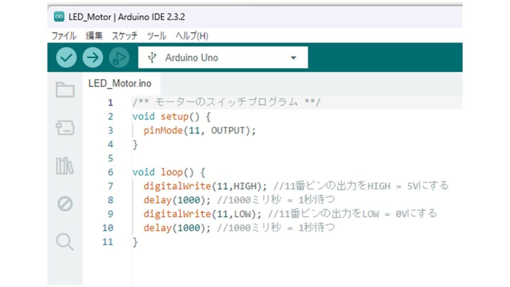 7行目では,11番ピンにHIGH信号を出力しています。すなわち,モーターが回転します。8行目は回転を0.1sec持続する命令です。