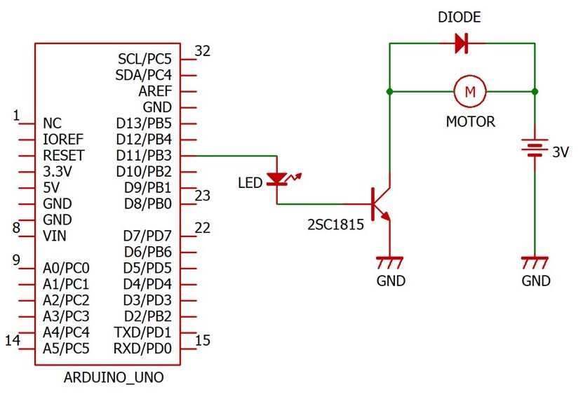 まず,実体配線図を示します。トランジスタが登場したのがわかると思います。モーターを回すには大きな電流が必要なのですが,Arduinoの出力はそんなに大きくありません。そこで,Arduinoの小さな出力をきっかけにしてモーターを回したり,止めたりします。このとき,トランジスタのスイッチング作用を用います。