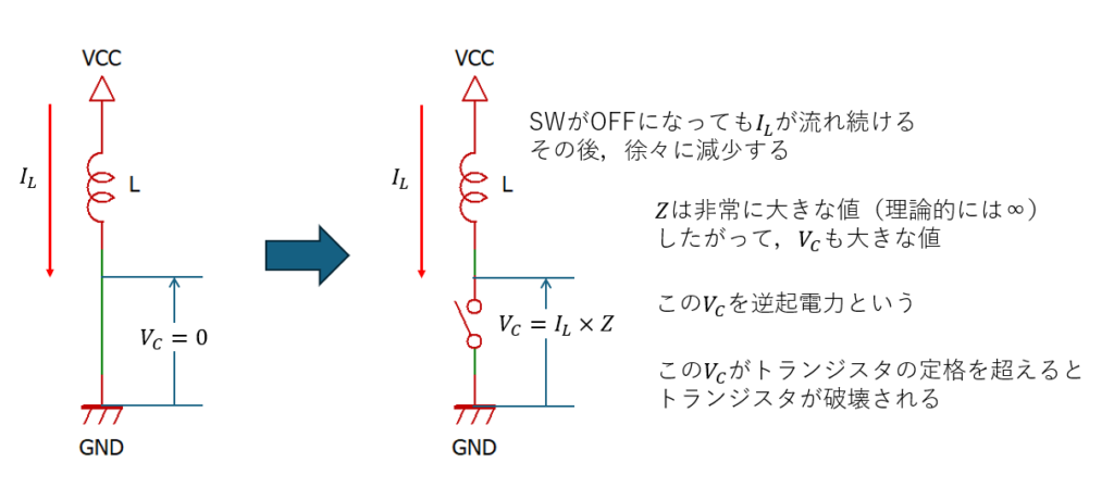 ダイオードはアノード(A)からカソード(K)へ電流を流しますから,スイッチOFF時の電流ILをVcc側に逃してやることにより,逆起電力の影響を防止することができます!