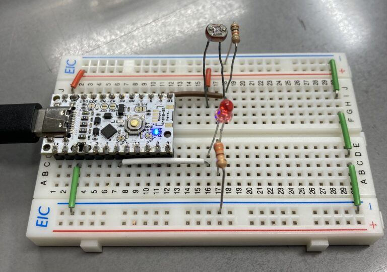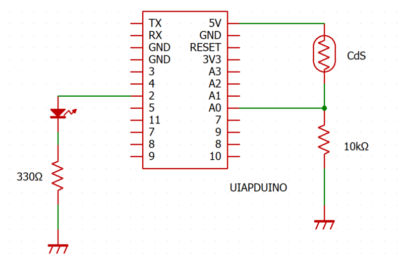 ここでは、CdSセルの出力値をUIAPduinoにアナログで入力し、⑴その値に応じてLEDの点滅速度を変化させる、⑵その値に応じてLEDの明るさを変化させる、ことに挑戦します。