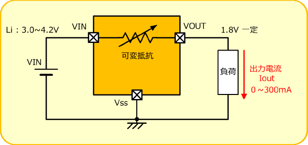 突然ですが,この図は電圧レギュレータの概要図です。ここでは,3端子型電圧レギュレータを考えます。まず,Vssは基準電圧です。図の場合はGNDに接続して0Vになっています。次に,VINは入力電圧になります。図の場合はここにリチウムバッテリが接続されています。最後に,VOUTは出力電圧を示します。図の場合は一定の電圧1.8Vが出力されます。一定です。ここがミソですが,例えばリチウム電池の電圧が3.0V~4.2Vの間で変動しても必ず1.8Vが出力されるのです。便利ですねー。