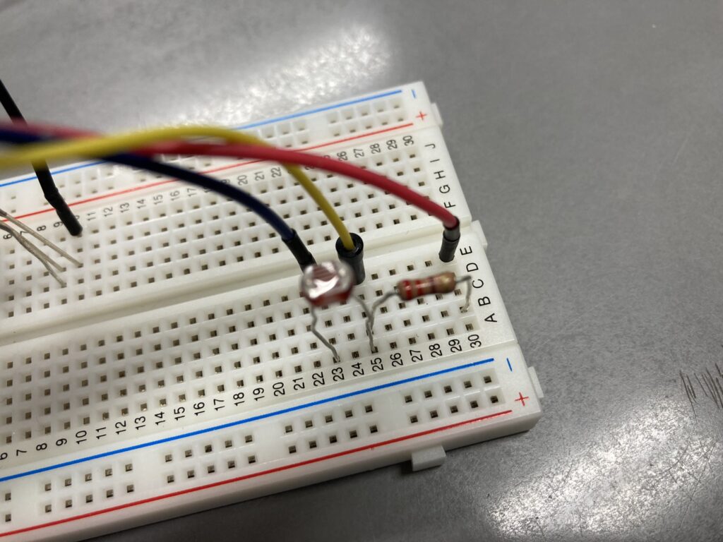 Arduinoの左側が入力になります。5Vを220Ωの抵抗とCdSの内部抵抗で分圧された電圧がA0端子にアナログ電圧として入力されます。