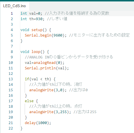 13行目から20行目までは,valの値がthの値よりも小さいかどうかで動作を分岐しています。先述の通り,valの値は周りが暗くなると大きくなります。したがって,13行目から16行目は周りが明るい状態のときの動作を示しています。17行目から20行目は暗いときですね。シリアルモニターを見てもらうとわかるのですが,valの値はかなり振れ幅があります。そこで,しきい値thを決めて,val < th の場合は明るい状態,そうでなければ暗い状態というように判断しています。